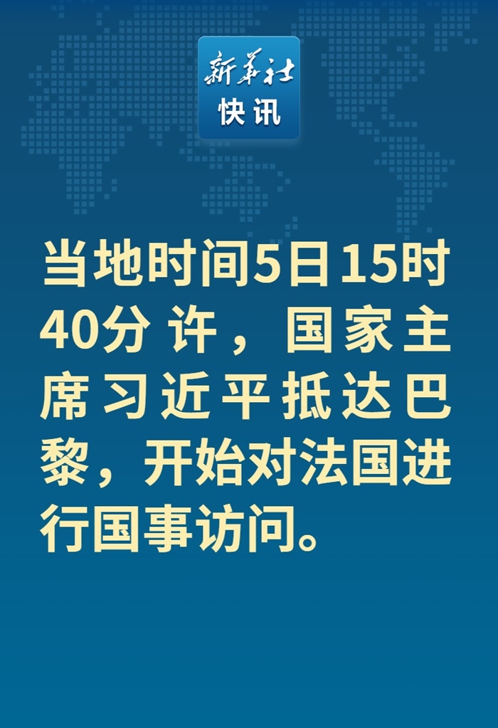 新華社快訊:當?shù)貢r間5日15時40分許,國家主席習近平抵達巴黎,開始對法國進行國事訪問。