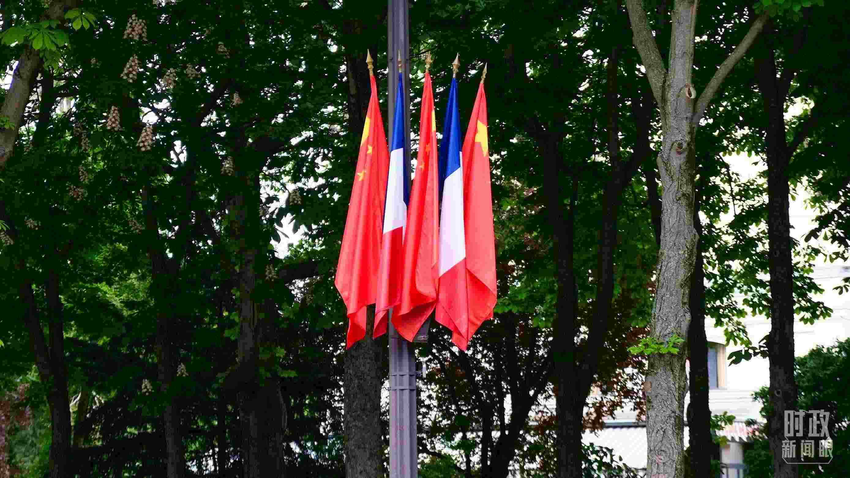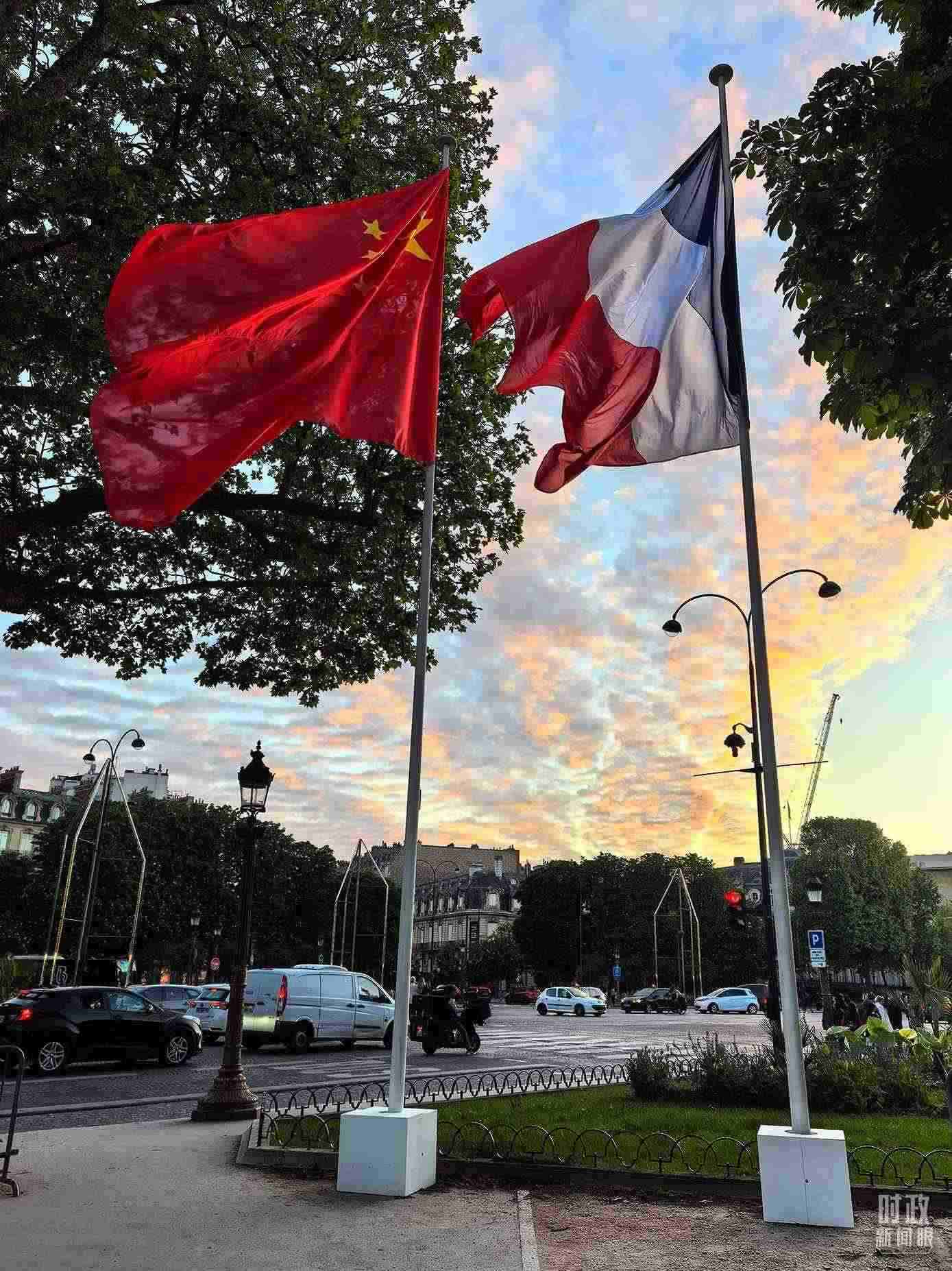 △愛麗舍宮周邊街道懸掛中法兩國國旗。(總臺央視記者劉琦拍攝)
