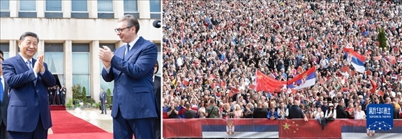 當(dāng)?shù)貢r(shí)間5月8日上午,國(guó)家主席習(xí)近平在貝爾格萊德塞爾維亞大廈同塞爾維亞總統(tǒng)武契奇舉行會(huì)談。會(huì)談前,武契奇陪同習(xí)近平來(lái)到政府大廈平臺(tái)(左圖)。大廈廣場(chǎng)上,一萬(wàn)五千名塞爾維亞民眾揮舞中塞兩國(guó)國(guó)旗,對(duì)習(xí)近平表示最熱烈的歡迎(右圖)。(拼版照片) 新華社記者 黃敬文 丁海濤 攝