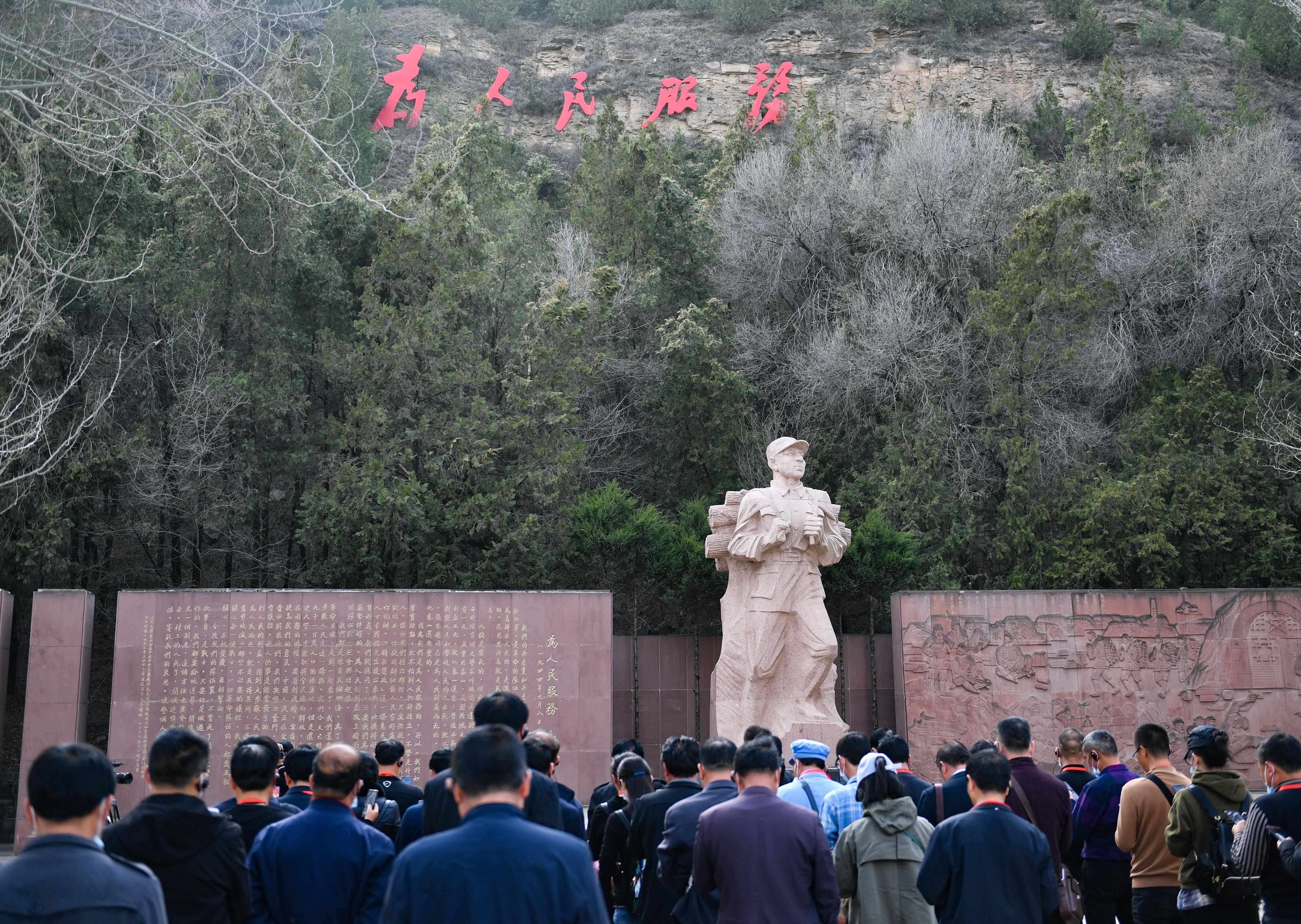 延安棗園,《為人民服務》講話紀念廣場,張思德負薪前行的雕像,巍然屹立,“為人民服務”5個鮮紅大字,熠熠生輝?!熬哂腥娜鉃橹袊嗣穹盏木瘛?,在黨的七大上被寫進黨章。