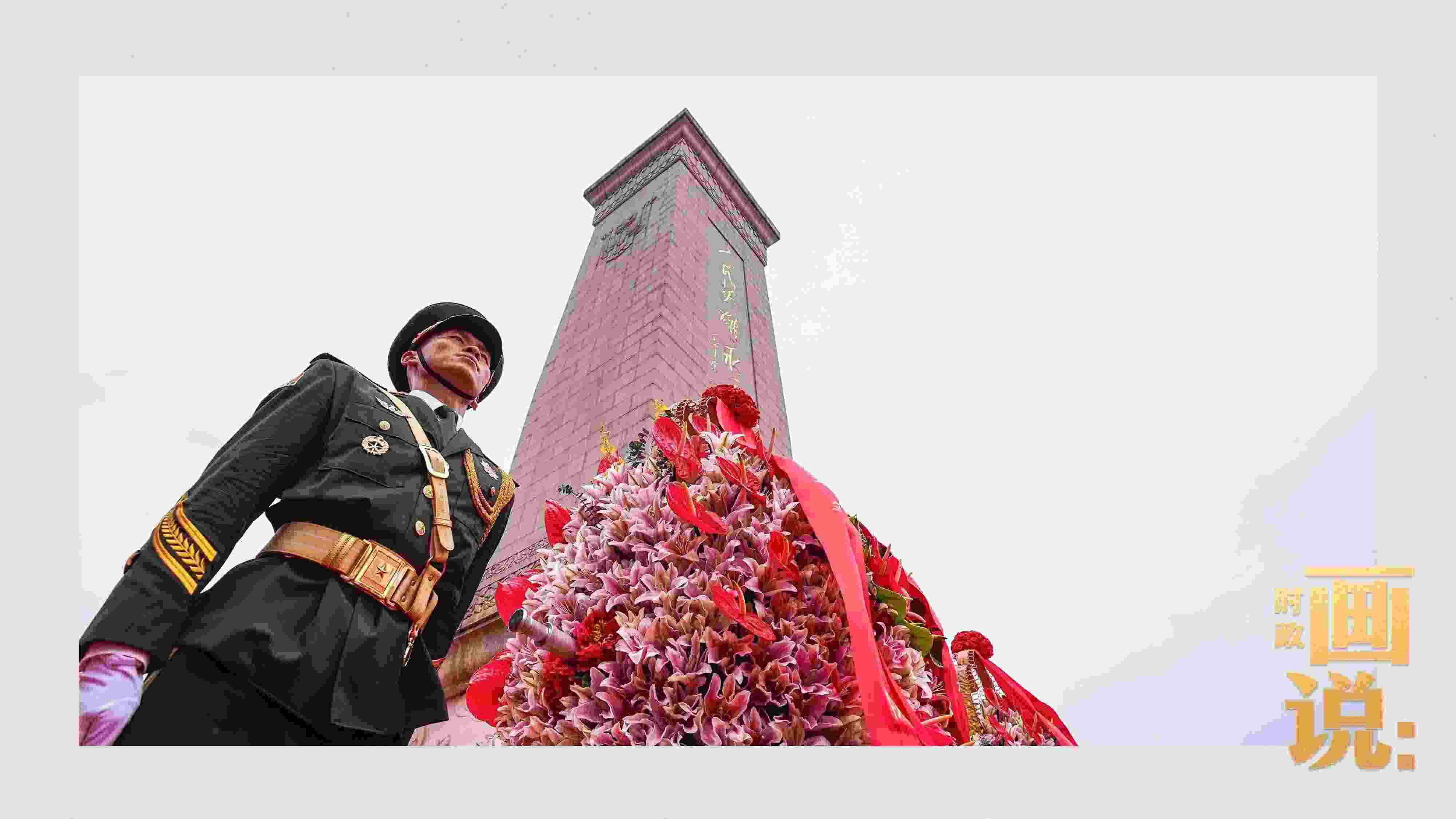 △少年兒童和各界代表依次走到紀念碑前,獻上手中鮮花并瞻仰紀念碑。