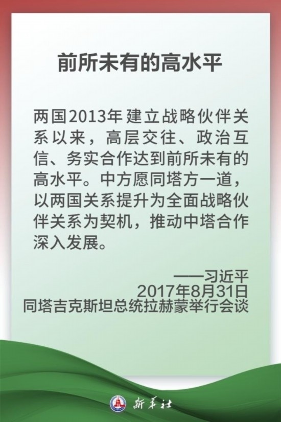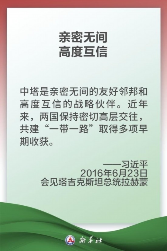 中國(guó)和塔吉克斯坦山水相連,兩國(guó)人民友好交往源遠(yuǎn)流長(zhǎng)。中塔建交30年多來(lái),兩國(guó)關(guān)系取得跨越式發(fā)展,達(dá)到全面戰(zhàn)略伙伴關(guān)系的歷史性高度。塔方最早同中方簽署共建“一帶一路”合作倡議,雙方率先建立發(fā)展共同體和安全共同體。