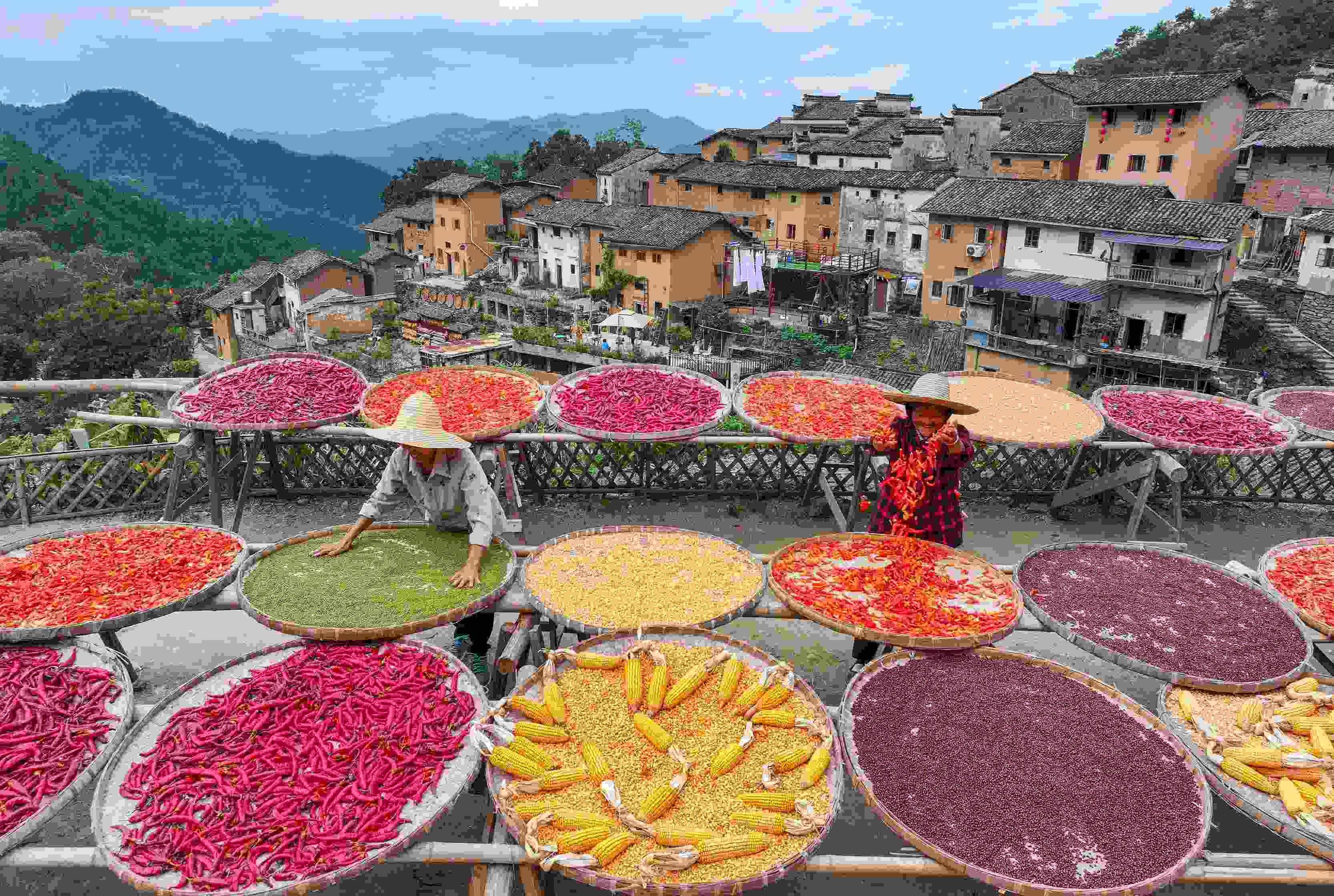 △2024年9月22日,安徽省黃山市歙縣陽產(chǎn)村,村民正在土樓前晾曬農(nóng)作物。