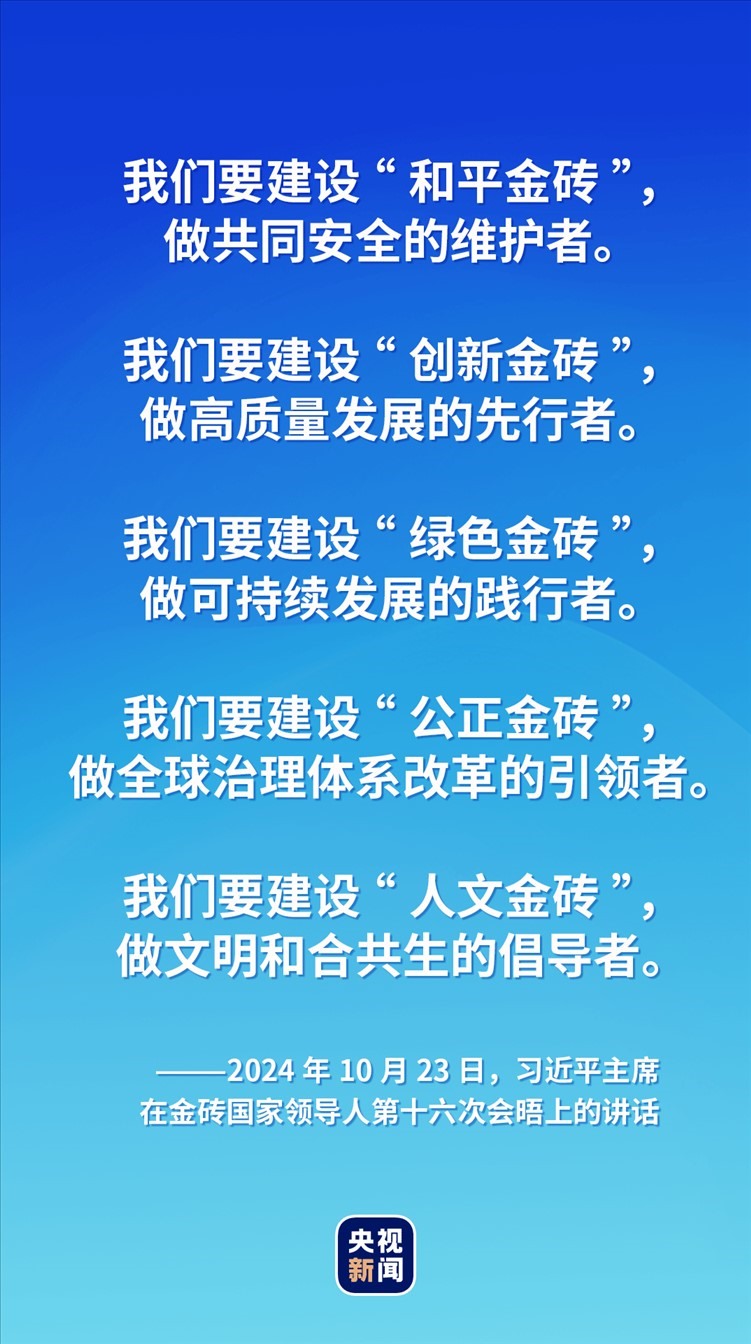 對(duì)于如何推動(dòng)“大金磚合作”高質(zhì)量發(fā)展,習(xí)近平主席提出五點(diǎn)建議——建設(shè)“和平金磚”“創(chuàng)新金磚”“綠色金磚”“公正金磚”“人文金磚”,攜手更多“全球南方”國(guó)家共同推動(dòng)構(gòu)建人類命運(yùn)共同體。