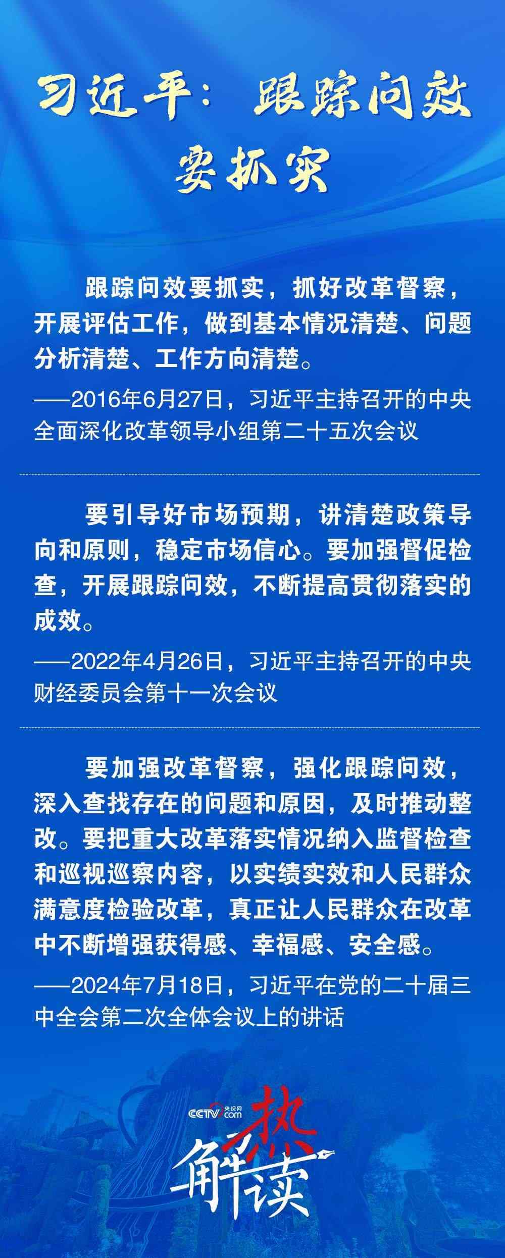 今年7月,在黨的二十屆三中全會(huì)第二次全體會(huì)議上,習(xí)近平總書記進(jìn)一步提出,要強(qiáng)化跟蹤問效,深入查找存在的問題和原因,及時(shí)推動(dòng)整改。