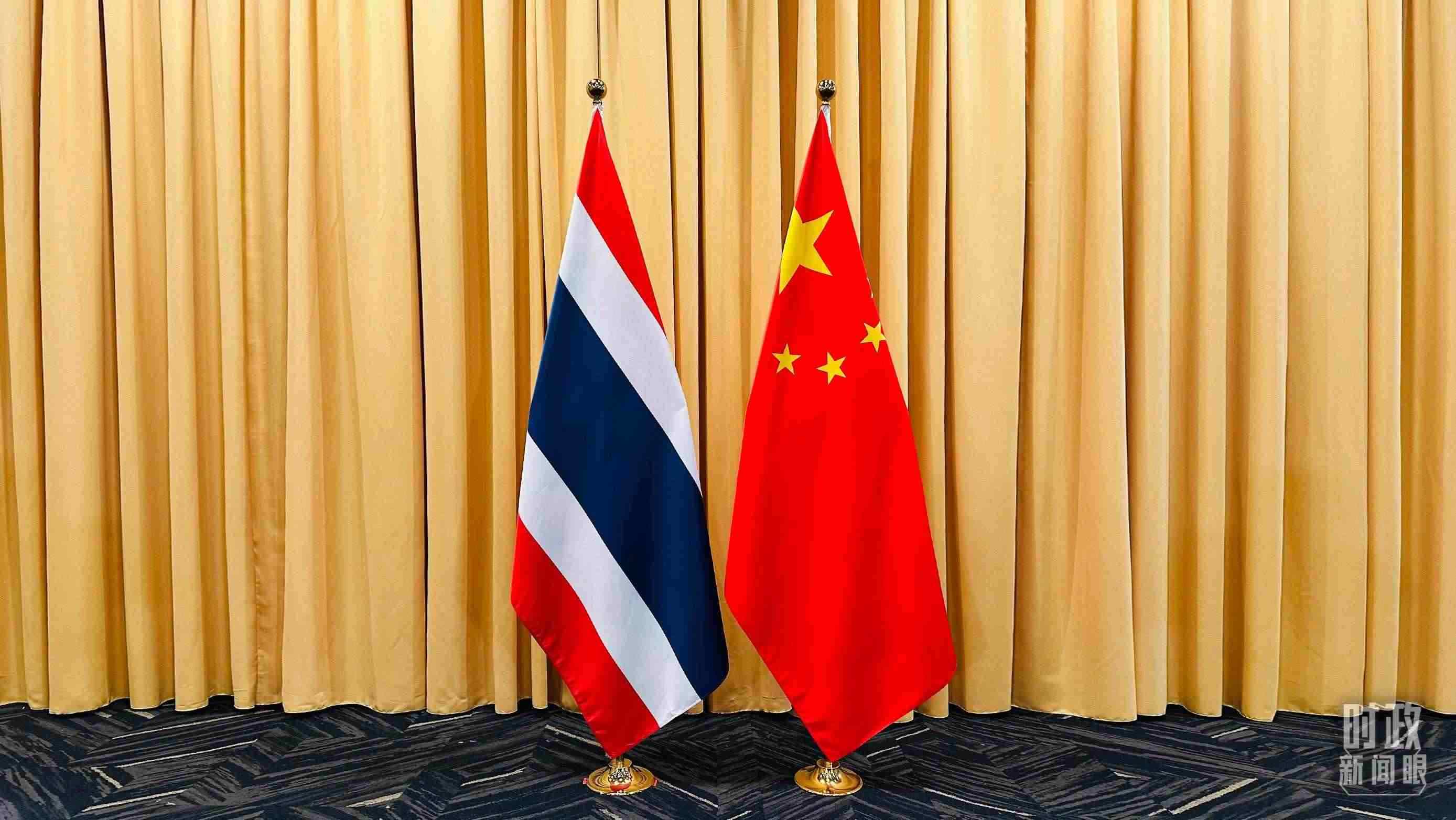 △會見現(xiàn)場的中泰兩國國旗。(總臺央視記者范一鳴拍攝)