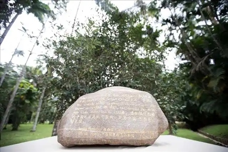 △巴西里約熱內(nèi)盧植物園,來自中國(guó)福建的華安石紀(jì)念牌記載:“1812年,首批抵達(dá)巴西的中國(guó)人在此栽下茶樹”。