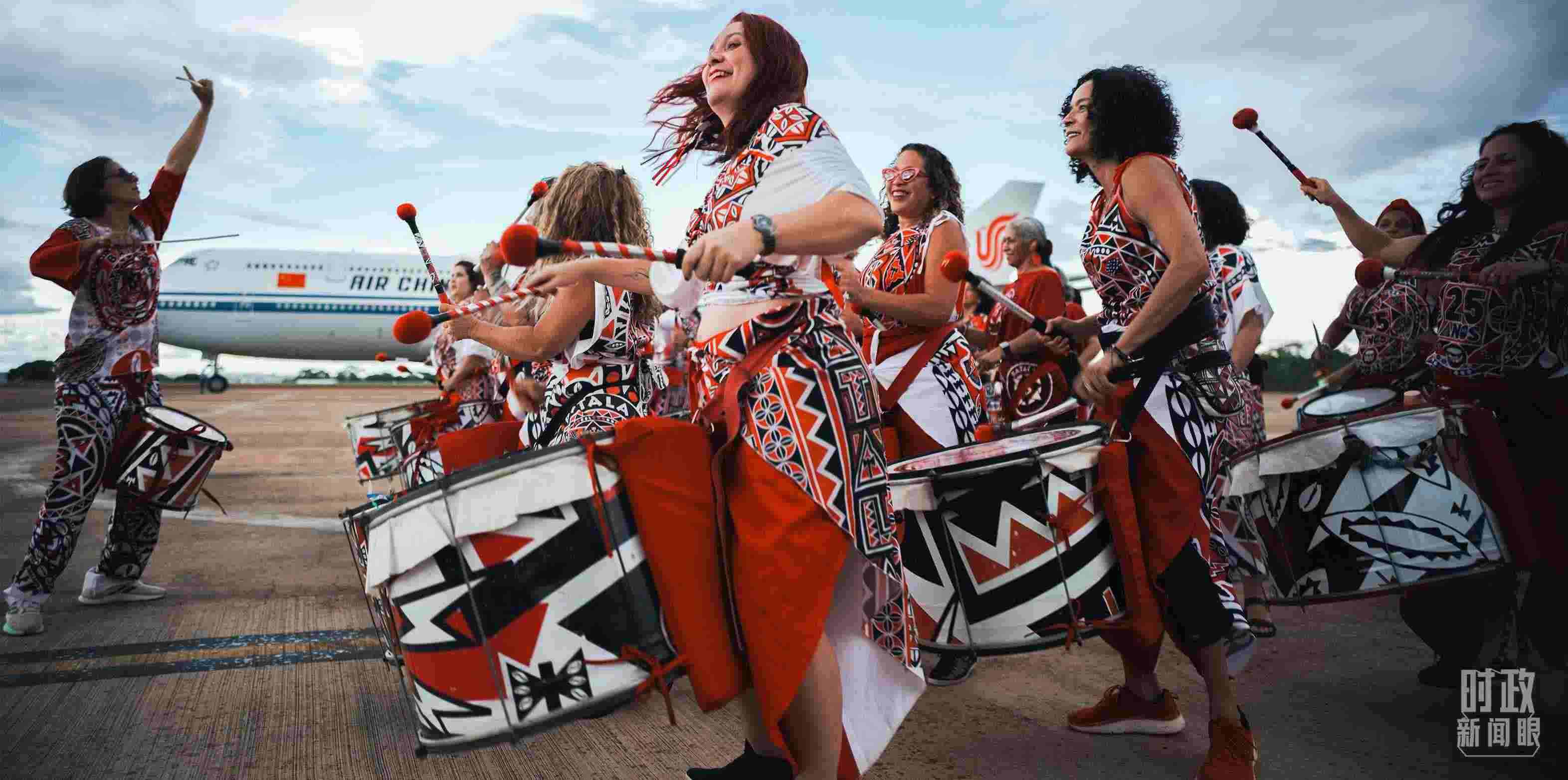 △習(xí)主席乘專(zhuān)機(jī)抵達(dá)巴西利亞,藝術(shù)家演奏特色鼓樂(lè)。(總臺(tái)央視記者彭漢明拍攝)