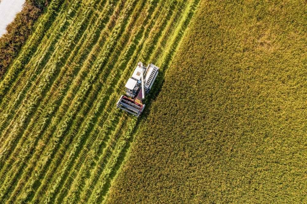 2024年10月25日,收割機(jī)在浙江省湖州市吳興區(qū)東林鎮(zhèn)保國(guó)村的稻田里作業(yè)(無人機(jī)照片)。新華社記者 徐昱 攝