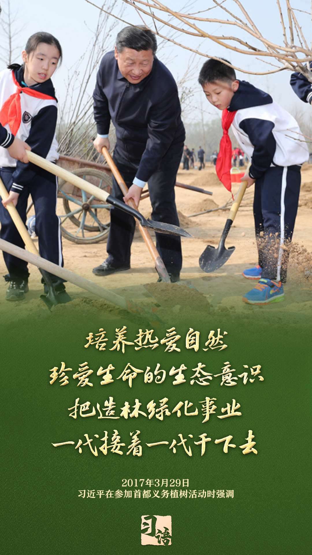 “植樹造林是一件很有意義的事情,是一項功在當代、利在千秋的崇高事業(yè),要一以貫之、持續(xù)做下去?!弊?013年以來的13個春天里,無論晴雨,習近平總書記都會拿起鐵鍬,與干部群眾一起參加首都義務植樹活動。鏟土造坑、培土圍堰、提水澆灌,總書記身體力行種下綠色的希望,對擴綠興綠護綠、建設美麗中國提出明確要求。一起學習。