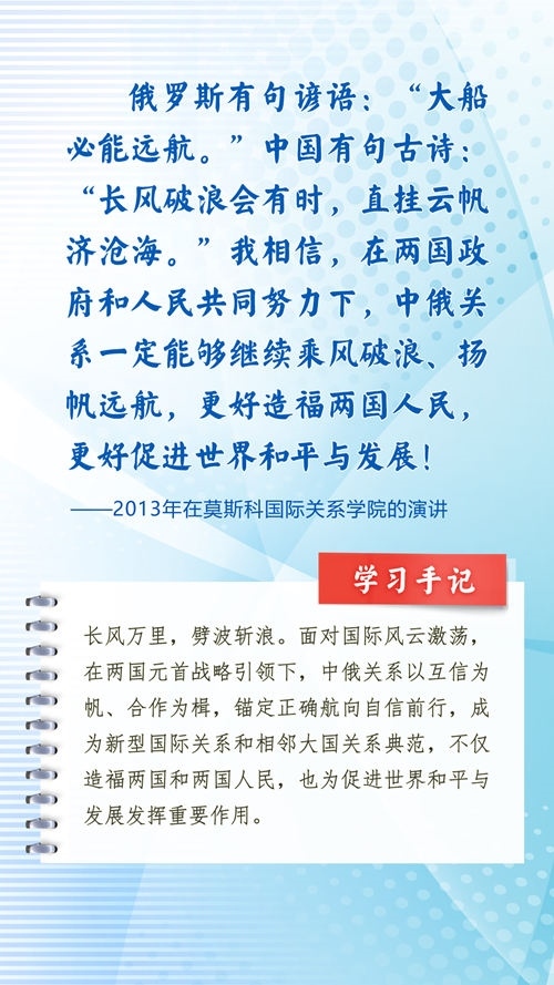 我們一起來學(xué)習(xí)品讀這些飽含哲思的論述,從中感悟新時(shí)代中俄關(guān)系在復(fù)雜的外部環(huán)境下堅(jiān)毅前行之道,感悟習(xí)近平主席作為大黨大國領(lǐng)袖、世界級領(lǐng)袖的時(shí)代擔(dān)當(dāng)與天下情懷。