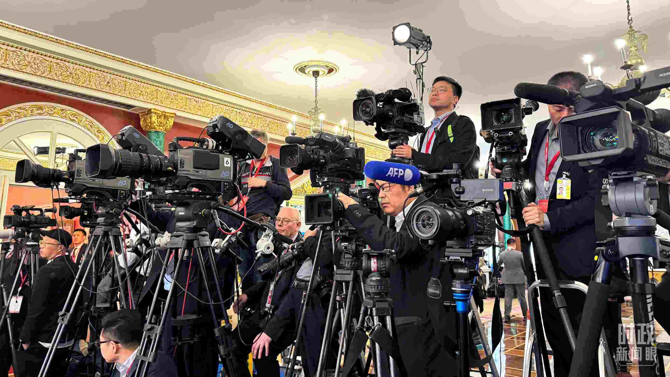 △等待中俄兩國(guó)元首共見(jiàn)記者的中外媒體同仁。(總臺(tái)央視記者陸泓宇、蔣碩拍攝)