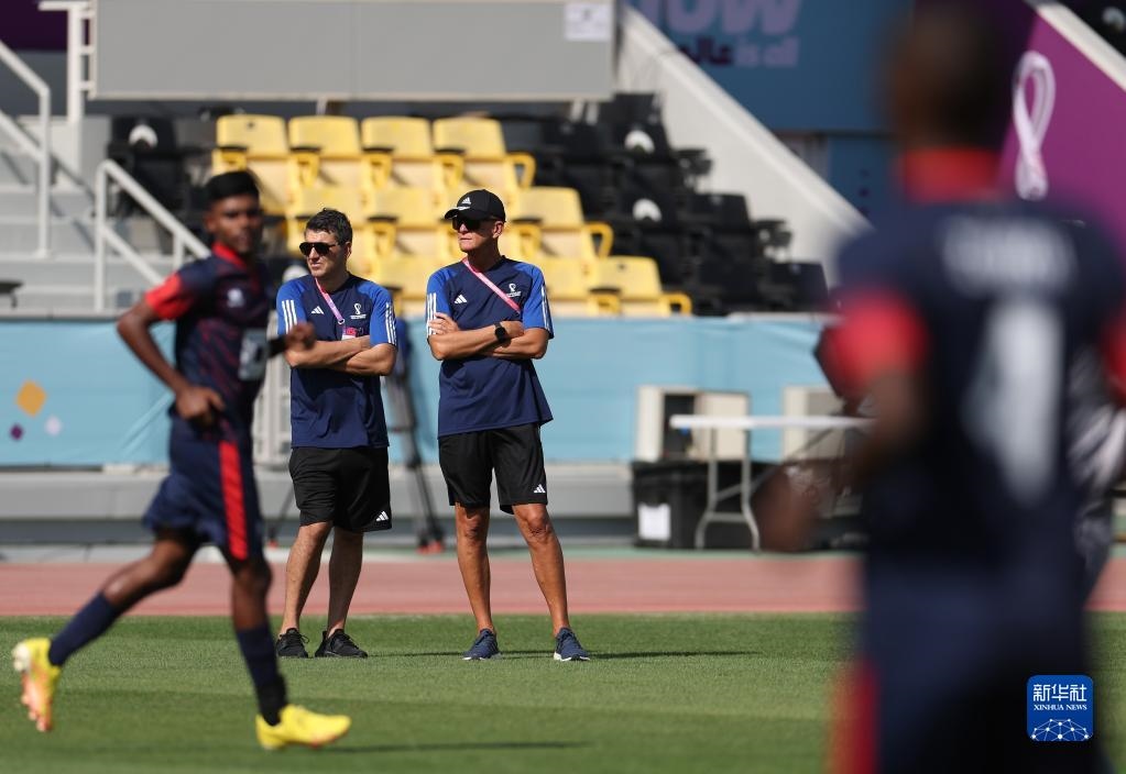11月18日,國際足聯(lián)裁判委員會主席皮耶路易吉·科利納(下)觀看訓(xùn)練。新華社記者 賈浩成 攝