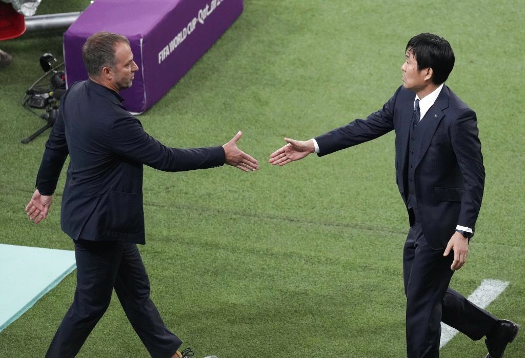 11月23日,德國(guó)隊(duì)主教練弗利克(左)與日本隊(duì)主教練森保一在賽后握手。新華社記者陳誠(chéng)攝