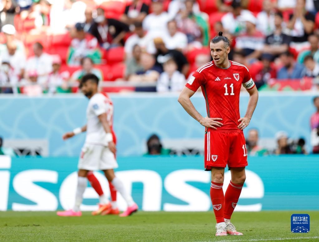 11月25日,威爾士隊球員加雷斯·貝爾(中)在本隊被打入第一粒進(jìn)球后。新華社記者 賈浩成 攝