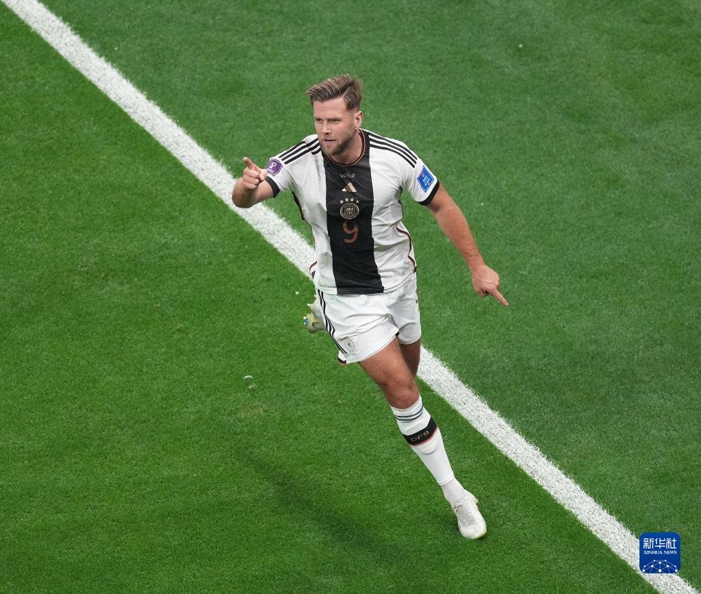 11月27日,德國隊球員尼克拉斯·菲爾克魯格在比賽中進(jìn)球后慶祝。新華社記者 陳誠 攝