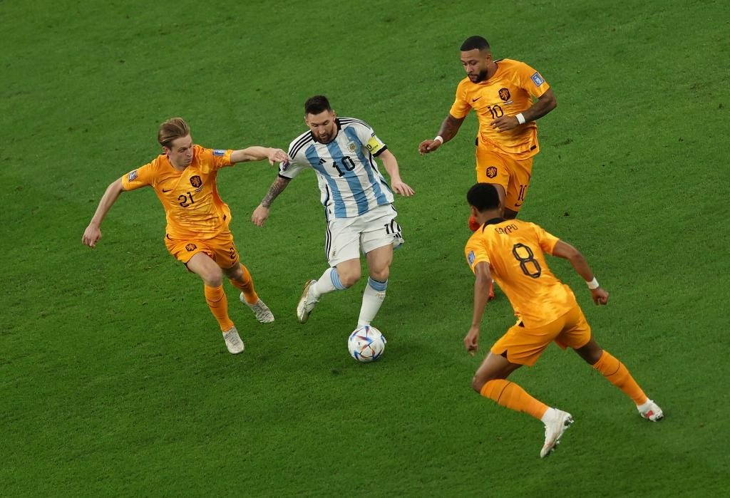 12月9日,阿根廷隊(duì)球員梅西(左二)在對(duì)荷蘭隊(duì)的比賽中進(jìn)攻。新華社記者 潘昱龍 攝
