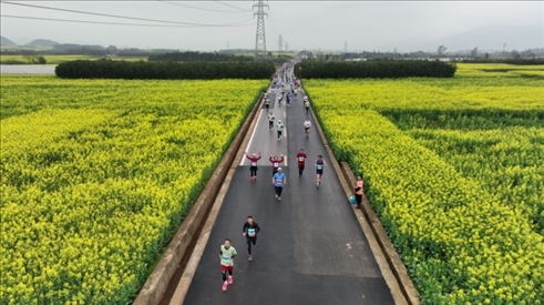 來(lái)自海內(nèi)外的1萬(wàn)余名專業(yè)運(yùn)動(dòng)員和馬拉松愛(ài)好者在云南羅平縣的花海中奔跑。何新文攝