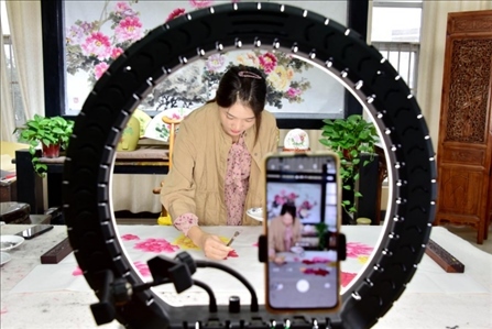 河南省洛陽(yáng)市孟津區(qū)平樂(lè)鎮(zhèn)中國(guó)牡丹畫(huà)創(chuàng)意園區(qū),村民正在通過(guò)網(wǎng)絡(luò)直播推介牡丹畫(huà)。李衛(wèi)超攝