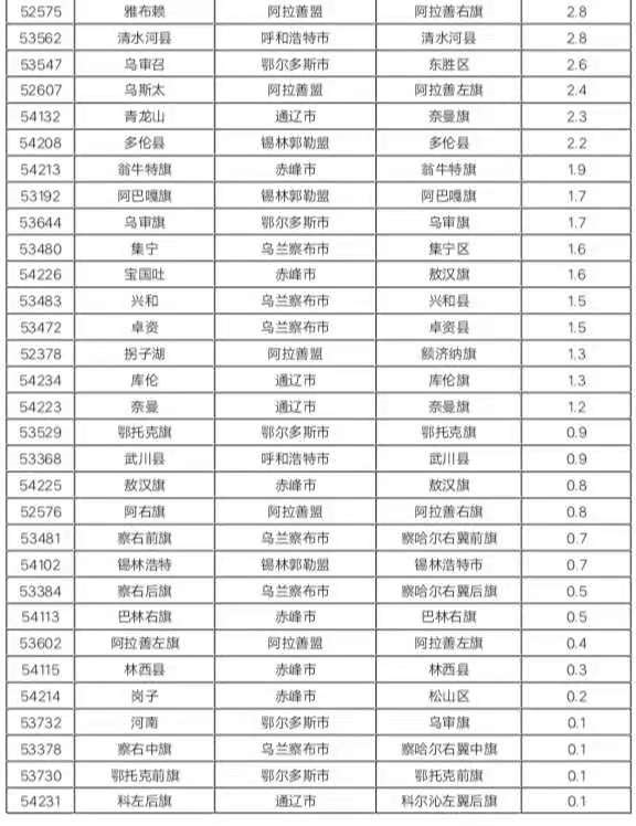 小雪:24個旗縣共28個站出現(xiàn)小雪,其中,阿拉善盟阿拉善左旗烏斯太2.4毫米、通遼市奈曼旗青龍山2.3毫米、錫林郭勒盟多倫縣2.2毫米。