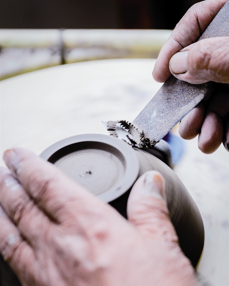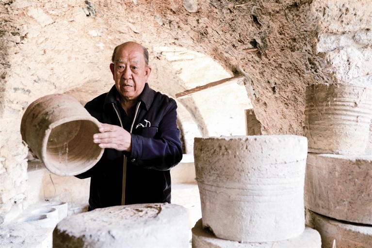隨后,他走進“饅頭窯”旁邊的一口窯洞,這是當時張家的一間手工作坊,揉泥、拉坯、上釉等一系列制作陶瓷的工序都是在這里完成?!拔揖统錾谶@個村子,已經(jīng)是張家瓷藝的第九代傳人了。作為中國磁州窯譜系,清水河黑礬溝瓷藝生產(chǎn)歷史至少已有800年?!标P(guān)于這項非遺的歷史故事,張選老人向記者娓娓道來:大約400年前,他們張家走西口從山西來到清水河謀生,當時清水河黑礬溝有一家姓杜的人家做陶瓷營生,張家的先人在杜家打工,大概這樣打工做了三輩人吧,杜家忽然不做了,搬離了黑礬溝,他們張家便把杜家的產(chǎn)業(yè)買了下來繼續(xù)做。“那個時候黑礬溝生產(chǎn)的瓷器都與人們生活息息相關(guān),比如腌菜缸、水甕、碗盤等,一個家庭手工作坊一天能生產(chǎn)500個碗呢,生意很好,人們靠做這個營生也過上了不錯的生活?!睆堖x回憶著清水河瓷藝鼎盛時期的場景。上個世紀70年代,由于交通、技術(shù)等原因,黑礬溝燃燒了幾百年的窯火熄滅,傳統(tǒng)“饅頭窯”被正式廢棄,轉(zhuǎn)移到窯溝鄉(xiāng)后手工作坊變成了機械化生產(chǎn),這也讓清水河的陶瓷名聲大噪。當時,在窯溝鄉(xiāng)一帶,從事陶瓷生產(chǎn)的有近萬人,陶瓷業(yè)成為清水河支柱產(chǎn)業(yè)。