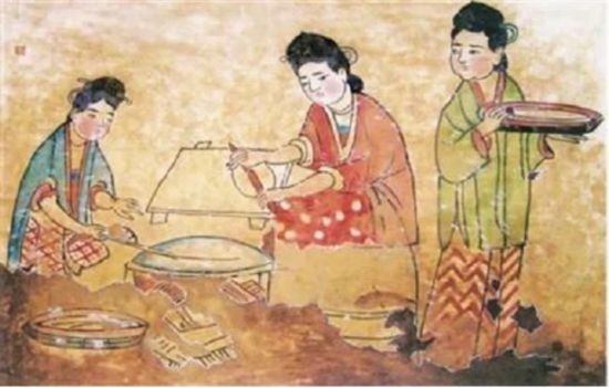 2003年,河南省登封市高村發(fā)掘了一座宋代壁畫墓,其中的“烙餅圖”非常生動(dòng)寫實(shí)。畫中有3位女子,左側(cè)女子正在鏊子前持物翻餅,其右置一圓盒,內(nèi)有烙好的煎餅。鏊子呈穹廬狀鼓起,同現(xiàn)在常見的鐵鏊無異。中間女子正在矮案前持兩頭尖、中間粗的搟面棍搟制面皮。右側(cè)女子雙手托盤,似走卻又回首觀望。整幅壁畫色彩艷麗,人物各具情態(tài),栩栩如生。