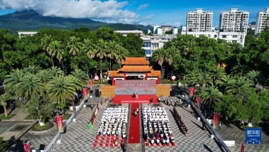 這是7月8日拍攝的五指山“上山爽一夏 故園·畢業(yè)季”暨州府故園文化節(jié)啟動儀式現場(無人機照片)。