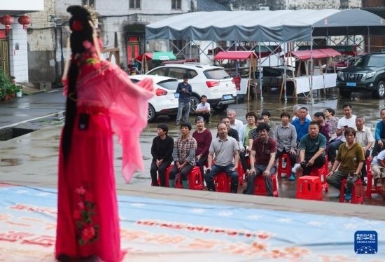 6月25日,澧浦鎮(zhèn)鄭店村百姓在觀看光南文化禮堂大舞臺上婺之靈坐唱班表演的婺?。o人機(jī)照片)。
