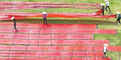 3月26日,廣東省佛山市順德區(qū)一香云紗產(chǎn)研文化基地的工人,利用晴好天氣抓緊時(shí)間曬香云紗。王國榮攝(人民圖片)