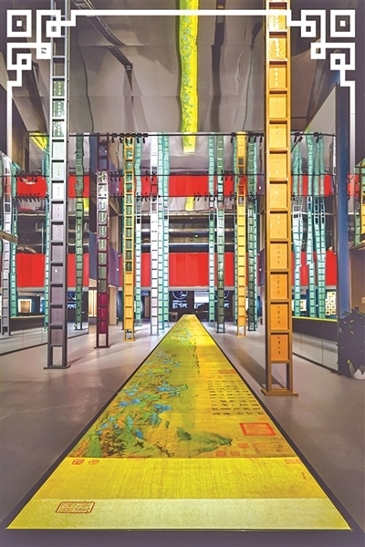 走進(jìn)展廳,墨綠色、宮墻紅、灰藍(lán)色不一的墻面上,懸掛著用淺色木框裝裱的繪畫展品,素淡清雅,古韻悠然。展廳中間,《千里江山圖》高清打樣稿鋪展開來,如同一條流淌的青綠長河。放大兩倍后,畫中各種各樣的漁舟、山石的皴法依然清晰可辨。