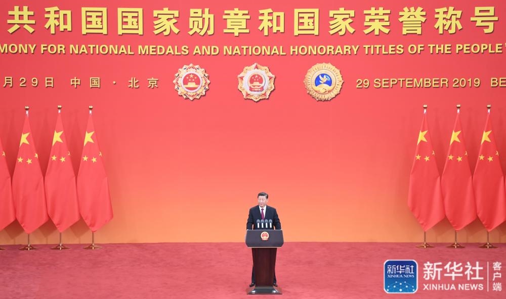 ↑9月29日,中華人民共和國(guó)國(guó)家勛章和國(guó)家榮譽(yù)稱號(hào)頒授儀式在北京人民大會(huì)堂金色大廳隆重舉行。中共中央總書(shū)記、國(guó)家主席、中央軍委主席習(xí)近平向國(guó)家勛章和國(guó)家榮譽(yù)稱號(hào)獲得者頒授勛章獎(jiǎng)?wù)虏l(fā)表重要講話。新華社記者姚大偉攝