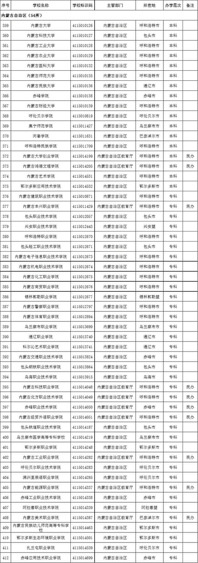 內(nèi)蒙古自治區(qū)2020年高校名單(54所)