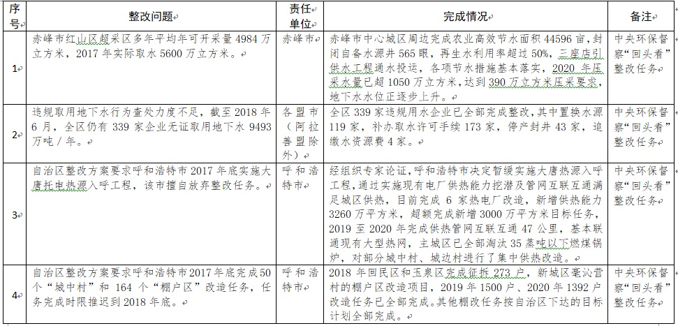 中央環(huán)境保護督察以來,自治區(qū)各級黨委政府及相關(guān)部門高度重視反饋意見整改工作,貫徹落實習(xí)近平生態(tài)文明思想的自覺性和主動性顯著增強,采取強有力措施積極推動整改工作,整改工作取得階段性成果。近期部分整改任務(wù)已通過自治區(qū)相關(guān)委辦廳局驗收,現(xiàn)予以公示,公示期2021年2月5日至2月9日,未提出異議的整改任務(wù)給予銷號(聯(lián)系電話:0471-4632171)。