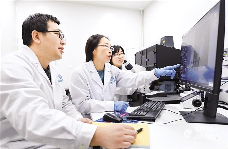 內(nèi)蒙古大學(xué)生命科學(xué)學(xué)院院長(zhǎng)、省部共建草原家畜生殖調(diào)控與繁育國(guó)家重點(diǎn)實(shí)驗(yàn)室主任胡薇(中)與團(tuán)隊(duì)成員觀察動(dòng)物的成纖維細(xì)胞結(jié)構(gòu)形態(tài)。內(nèi)蒙古日?qǐng)?bào)社融媒體記者