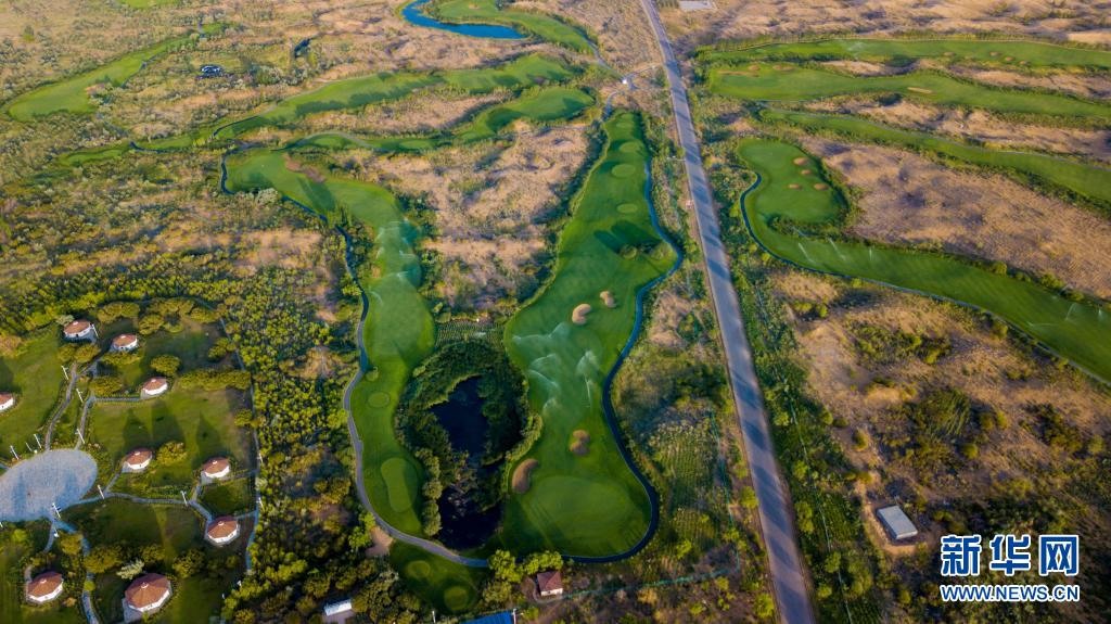 這是位于庫(kù)布其沙漠中的七星湖景區(qū)(2018年7月11日攝,無(wú)人機(jī)照片)。新華社記者 彭源 攝