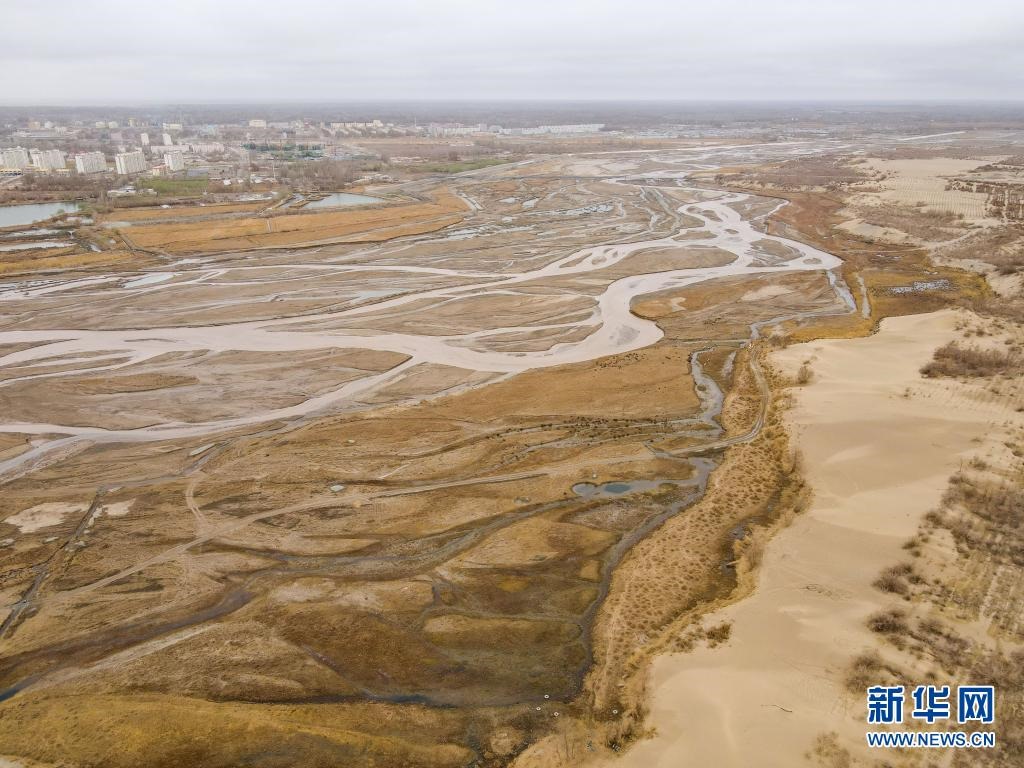 新疆且末縣城與塔克拉瑪干沙漠之間隔著車(chē)爾臣河(3月31日攝,無(wú)人機(jī)照片)。新華社記者 高晗 攝