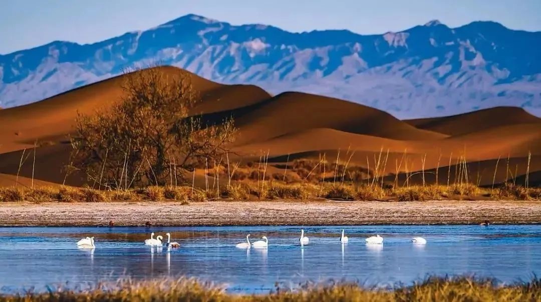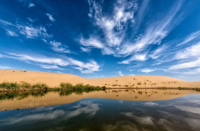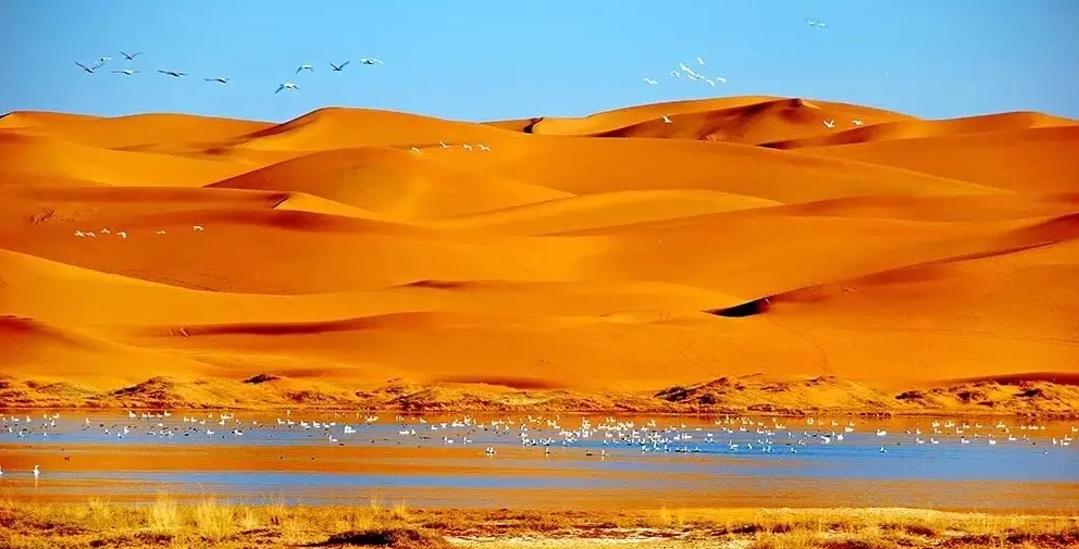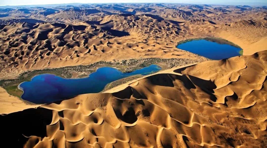巴丹吉林沙漠年降水量不足40毫米,但是沙漠中的湖泊竟然多達(dá)100多個。高聳入云的沙山,神秘莫測的鳴沙,靜謐的湖泊、濕地,構(gòu)成了巴丹吉林沙漠獨(dú)特的迷人景觀,于2005年被《中國國家地理》雜志評為中國最美麗的沙漠,每年吸引了上萬名國內(nèi)外游客前來觀光。