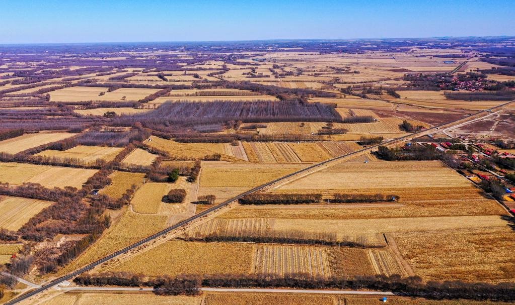 10月13日,這是通遼市奈曼旗義隆永鎮(zhèn)方家營子村待收的玉米。(無人機(jī)照片 新華社記者連振 攝)