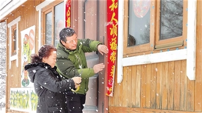 彭成良巡護(hù)回來,天上飄起了雪花。夫妻倆一起貼春聯(lián)、窗花,掛燈籠,凍冰燈。嶄新的木屋,紅紅的燈籠,醒目的春聯(lián),五彩的冰燈……被裝扮一新的管護(hù)站瞬間年味兒十足。為了讓春節(jié)更有儀式感,二人決定再堆兩個雪人。