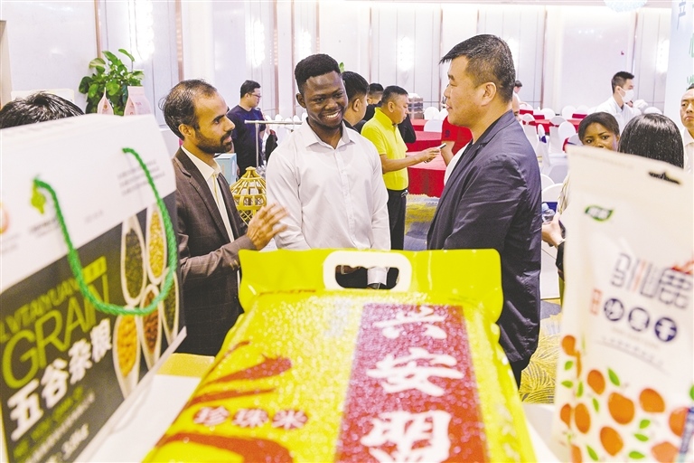 4月12日,第三屆中國國際消費(fèi)品博覽會國外參展商詳細(xì)了解內(nèi)蒙古興安盟綠色有機(jī)農(nóng)畜產(chǎn)品。消博會期間,“內(nèi)蒙古·興安盟投資貿(mào)易”推介會在海南省??谑信e行。推介會現(xiàn)場促成參會企業(yè)簽約項(xiàng)目9個(gè),預(yù)計(jì)合作投資額近12億元。作為國家重要的農(nóng)畜產(chǎn)品生產(chǎn)基地,來自內(nèi)蒙古的優(yōu)勢特色農(nóng)畜產(chǎn)品正走出中國賣向全球。(內(nèi)蒙古日報(bào)社融媒體記者 王曉博 攝)