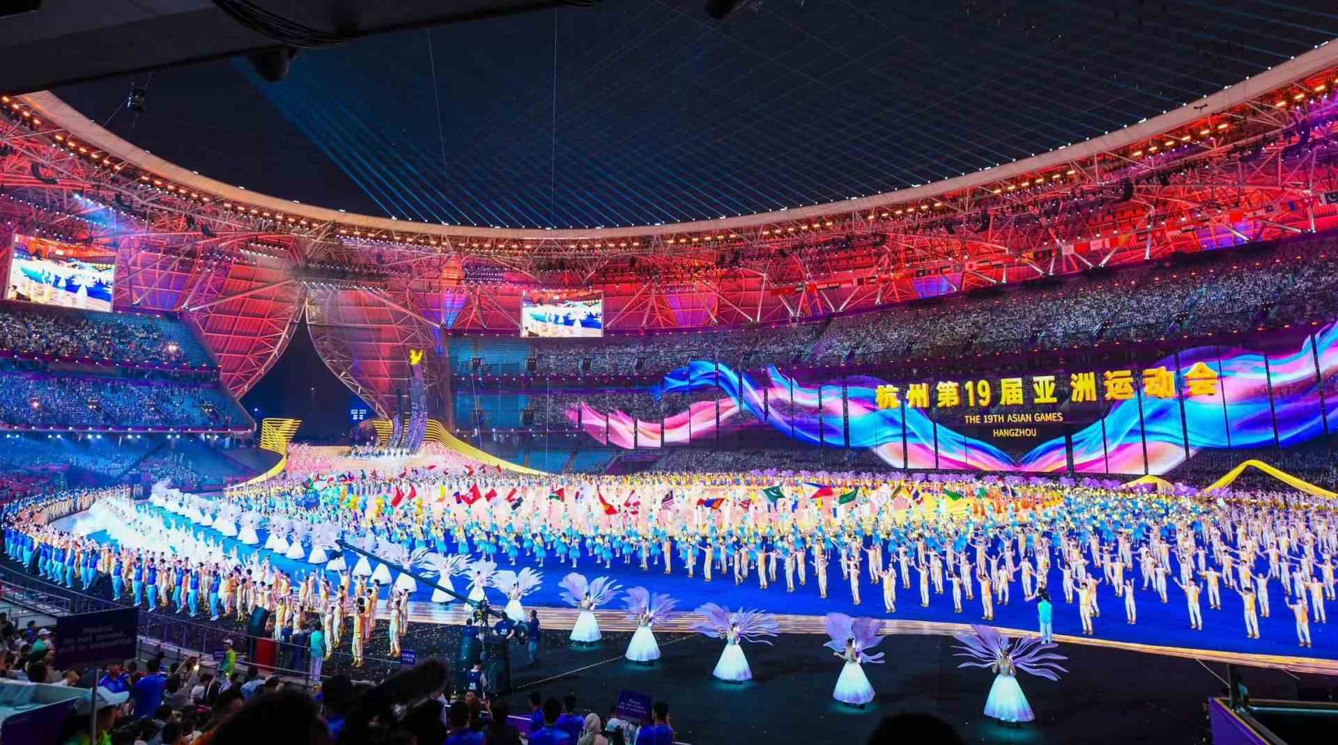 開(kāi)幕式文藝表演以“潮起亞細(xì)亞”為總主題,分為《國(guó)風(fēng)雅韻》《錢塘潮涌》《攜手同行》三大篇章,寓意著新時(shí)代的中國(guó)正與亞洲、世界交融激蕩,像浪潮一樣奔涌向前。開(kāi)幕式首次將3D雙威亞技術(shù)應(yīng)用于大型運(yùn)動(dòng)場(chǎng)中,首次實(shí)現(xiàn)“數(shù)實(shí)融合”點(diǎn)火儀會(huì)開(kāi)幕式在浙江省杭州市隆重舉行。開(kāi)幕式文藝表演以“潮起亞細(xì)亞”為總主題,分為《國(guó)風(fēng)雅韻》《錢塘潮涌》《攜手同行》三大篇章,寓意著新時(shí)代的中國(guó)正與亞洲、世界交融激蕩,像浪潮一樣奔涌向前。開(kāi)幕式首次將3D雙威亞技術(shù)應(yīng)用于大型運(yùn)動(dòng)場(chǎng)中,首次實(shí)現(xiàn)“數(shù)實(shí)融合”點(diǎn)火儀式。本次亞運(yùn)會(huì)有來(lái)自亞洲45個(gè)國(guó)家和地區(qū)代表團(tuán)的1.2萬(wàn)多名運(yùn)動(dòng)員報(bào)名參賽,共設(shè)40個(gè)大項(xiàng)、61個(gè)分項(xiàng)、481個(gè)小項(xiàng),是史上規(guī)模最大、項(xiàng)目最多、覆蓋面最廣的一屆亞運(yùn)會(huì)。