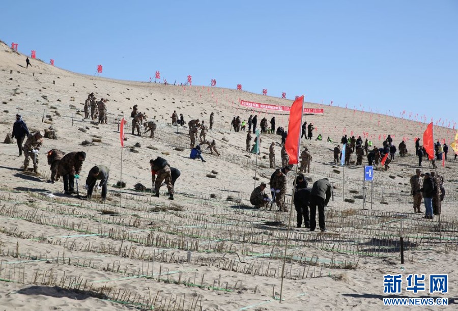 ??參會人員與專業(yè)技術(shù)服務(wù)隊(duì)以及社會各界代表,在渾善達(dá)克沙地設(shè)置沙障。新華網(wǎng) 石毅攝