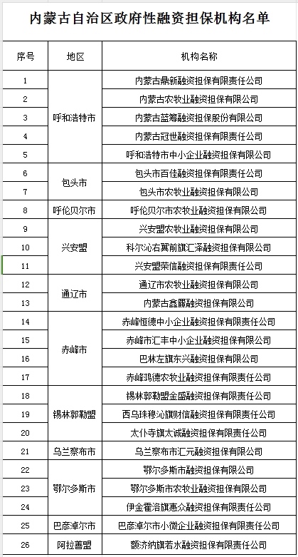 關(guān)于公布內(nèi)蒙古自治區(qū)政府性融資擔(dān)保機構(gòu)名單的通知