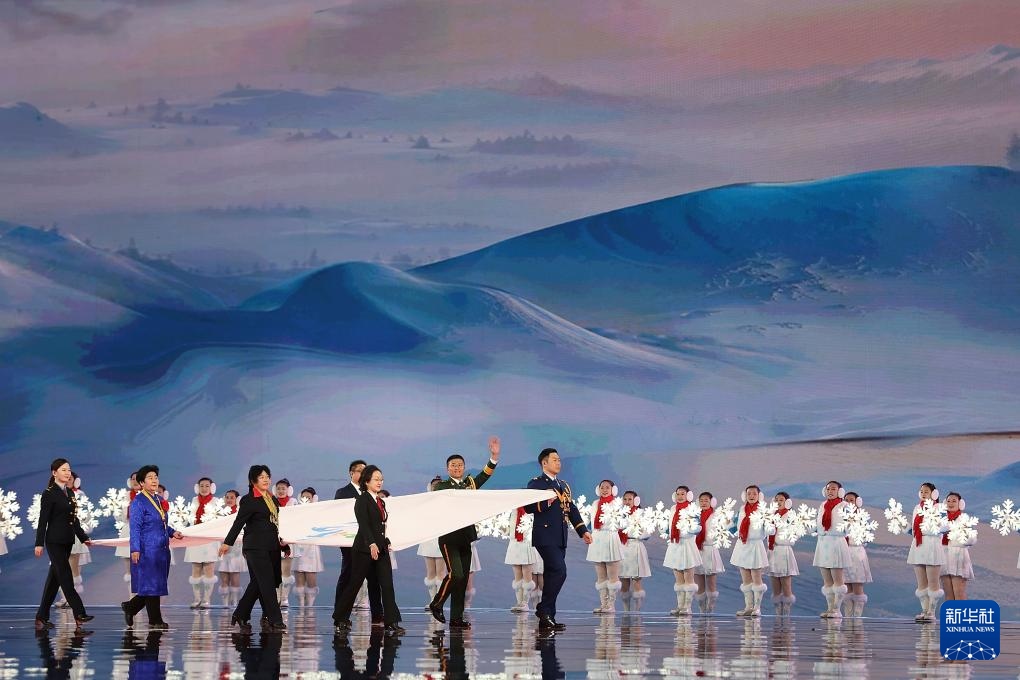 ??2月17日,中華人民共和國(guó)第十四屆冬季運(yùn)動(dòng)會(huì)會(huì)旗在開幕式上入場(chǎng)。新華社記者 楊晨光 攝