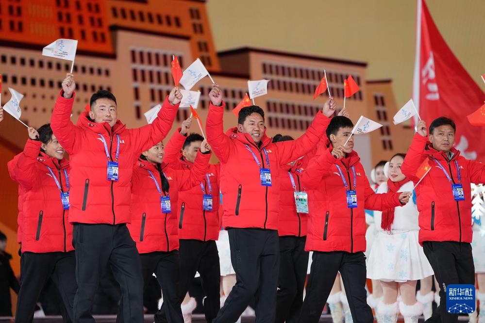 ??2月17日,新疆生產(chǎn)建設(shè)兵團(tuán)體育代表團(tuán)在開幕式上入場(chǎng)。新華社記者 李博 攝