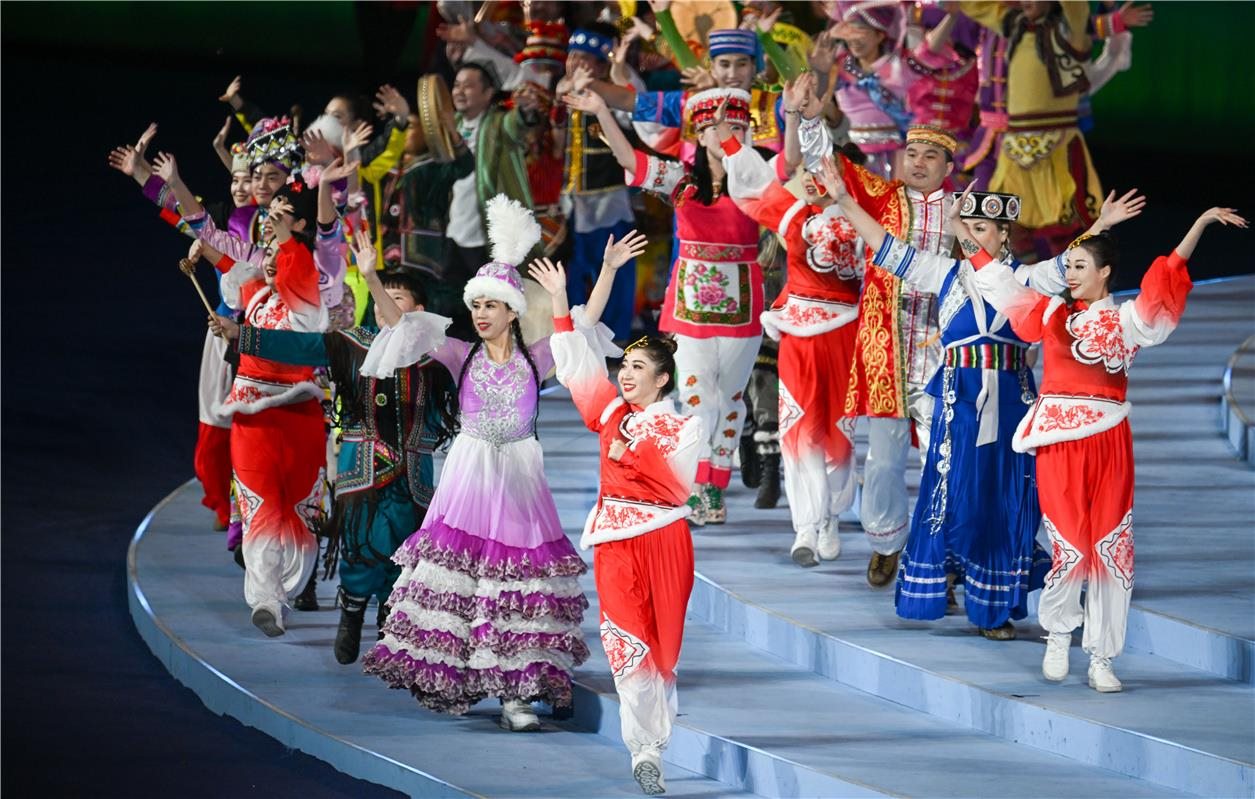其中文體展演包括序篇《共同的家園》、主篇章《山河共錦繡》《冰雪共相約》《攜手共奮進(jìn)》和尾聲《共同的未來》,展演將中國風(fēng)范、民族特色、北疆韻味、運動活力通過科技手段創(chuàng)意呈現(xiàn),在傳承與創(chuàng)新的碰撞下,展現(xiàn)了草原文化、冰雪文化和民族文化的多彩魅力。