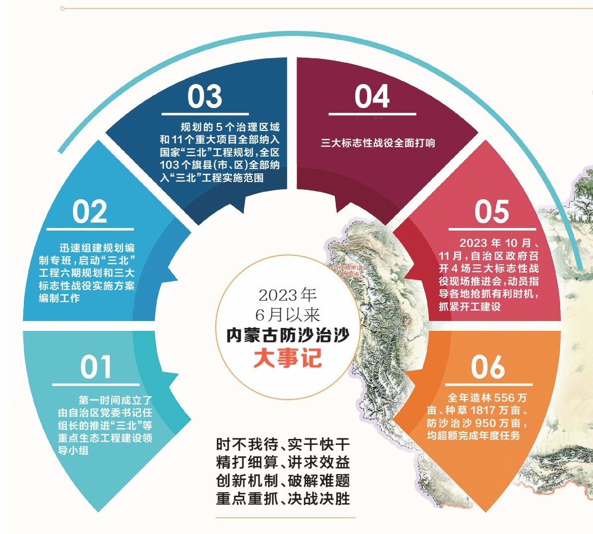 猶記得2023年的6月,習(xí)近平總書(shū)記親臨內(nèi)蒙古考察,主持召開(kāi)了加強(qiáng)荒漠化綜合防治和推進(jìn)“三北”等重點(diǎn)生態(tài)工程建設(shè)座談會(huì),發(fā)出堅(jiān)決打好“三北”工程攻堅(jiān)戰(zhàn)、努力創(chuàng)造新時(shí)代中國(guó)防沙治沙新奇跡的動(dòng)員令,并親自部署了“三北”工程三大標(biāo)志性戰(zhàn)役。
