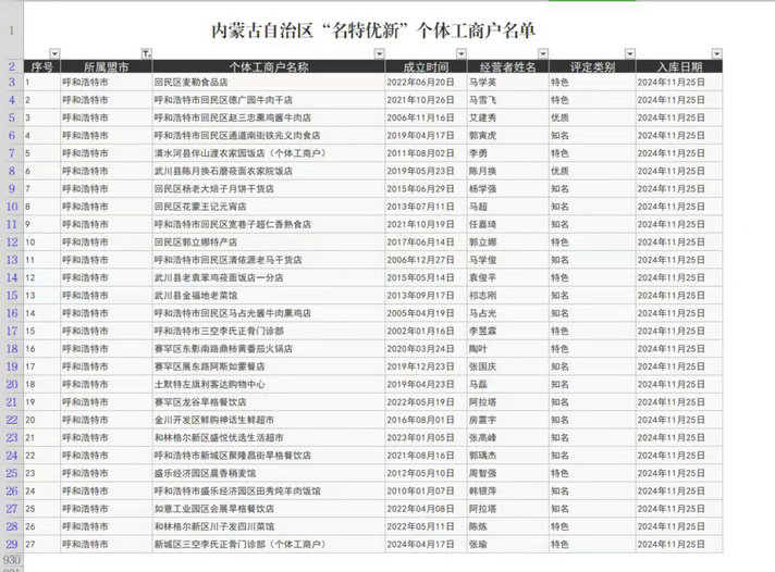 去年,呼和浩特市市場監(jiān)管局等16個市級部門聯(lián)合制定實施《呼和浩特市個體工商戶分型分類實施方案(試行)》,開展“名特優(yōu)新”個體工商戶申報和推薦工作。通過線上線下雙渠道,利用個體工商戶服務月活動,向廣大個體工商戶普及申報政策和流程,鼓勵符合條件的個體工商戶參與申報。通過材料審核、走訪核實、征求意見、評審認定、信息公示等程序,經(jīng)區(qū)縣、市、自治區(qū)逐級復核上報,呼和浩特市首批認定全國“名特優(yōu)新”的27戶個體工商戶已完成入庫(其中“知名”15戶、“特色”10戶、“優(yōu)質”2戶),被認定的個體工商戶可享受由國家、自治區(qū)、市出臺的相關扶持培育政策。