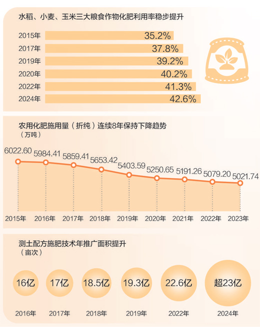 2024年,我國(guó)水稻、小麥、玉米三大糧食作物化肥利用率為42.6%,比2022年提高1.3個(gè)百分點(diǎn)?;世寐?,即化肥被作物吸收利用的比例,反映了化肥在農(nóng)業(yè)生產(chǎn)中的有效利用程度。科學(xué)施肥效果提升,折射農(nóng)業(yè)發(fā)展方式之變。