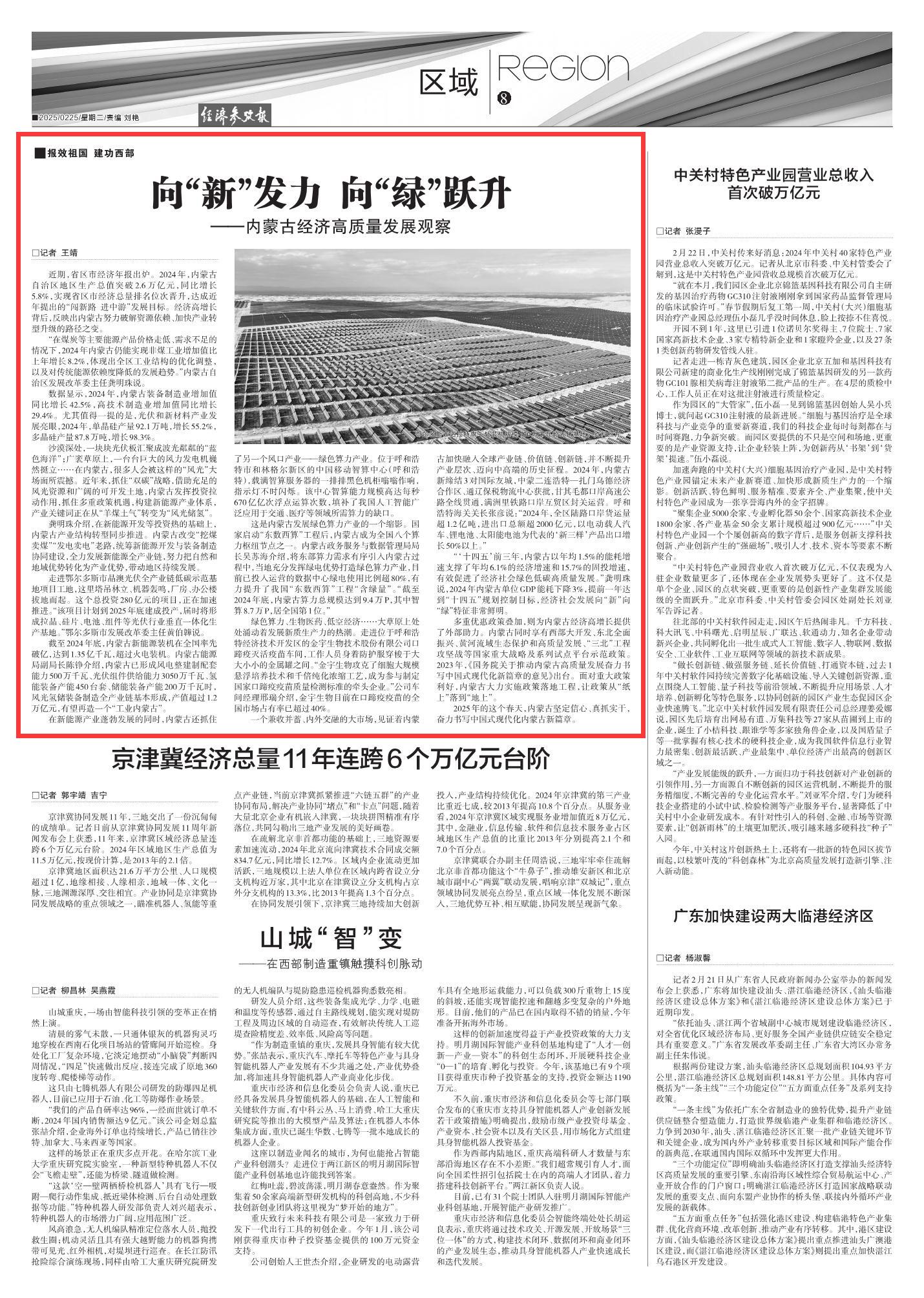 2025年2月25日《經(jīng)濟(jì)參考報(bào)》第8版刊發(fā)了《向“新”發(fā)力 向“綠”躍升——內(nèi)蒙古經(jīng)濟(jì)高質(zhì)量發(fā)展觀察》的文章,報(bào)道了多重優(yōu)惠政策疊加,為內(nèi)蒙古經(jīng)濟(jì)高增長(zhǎng)提供了外部助力,經(jīng)濟(jì)社會(huì)發(fā)展向“新”向“綠”特征非常鮮明,讓政策從“紙上”落到“地上”。